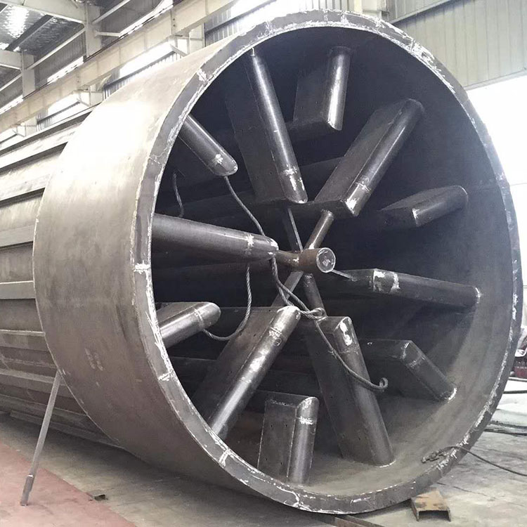 烘干機(jī)主機(jī)筒體是圓柱體,上半部分為雙層設(shè)計(jì),下半部分為槽鋼均勻分布,筒體尾端為圓錐體,出料口帶有推拉板,可用來(lái)調(diào)節(jié)出料口的大小。機(jī)體內(nèi)部有無(wú)縫鋼管均勻分布焊接,鋼管壁開(kāi)有小孔,可將熱風(fēng)均勻的充滿(mǎn)烘干機(jī)內(nèi)部。